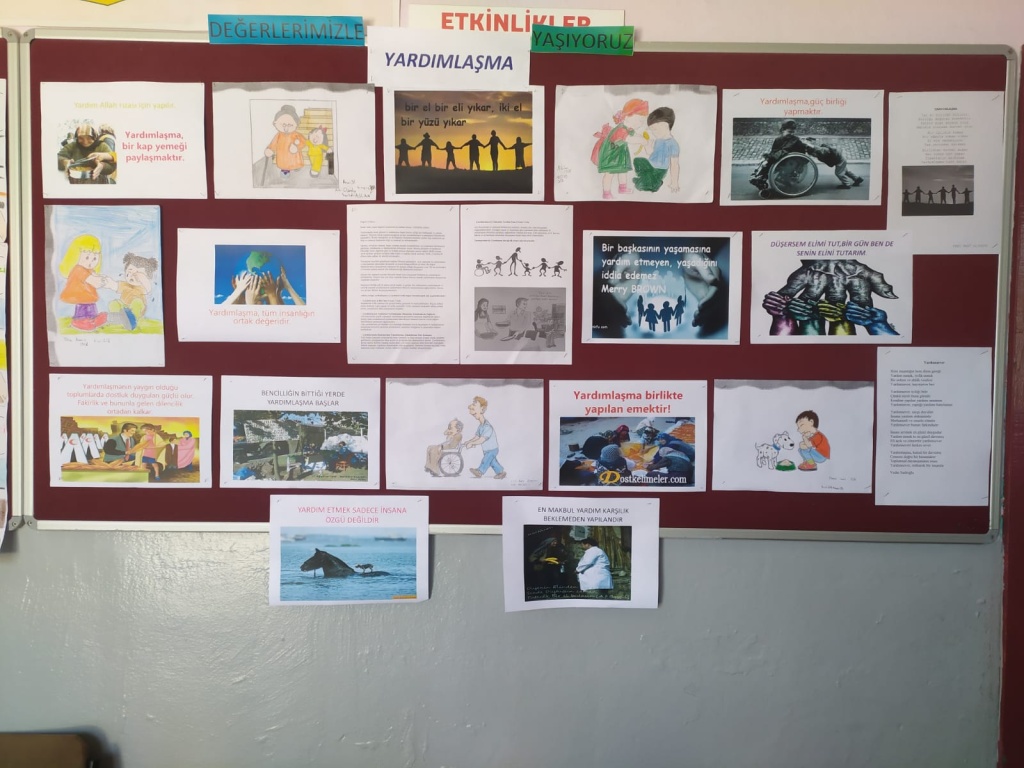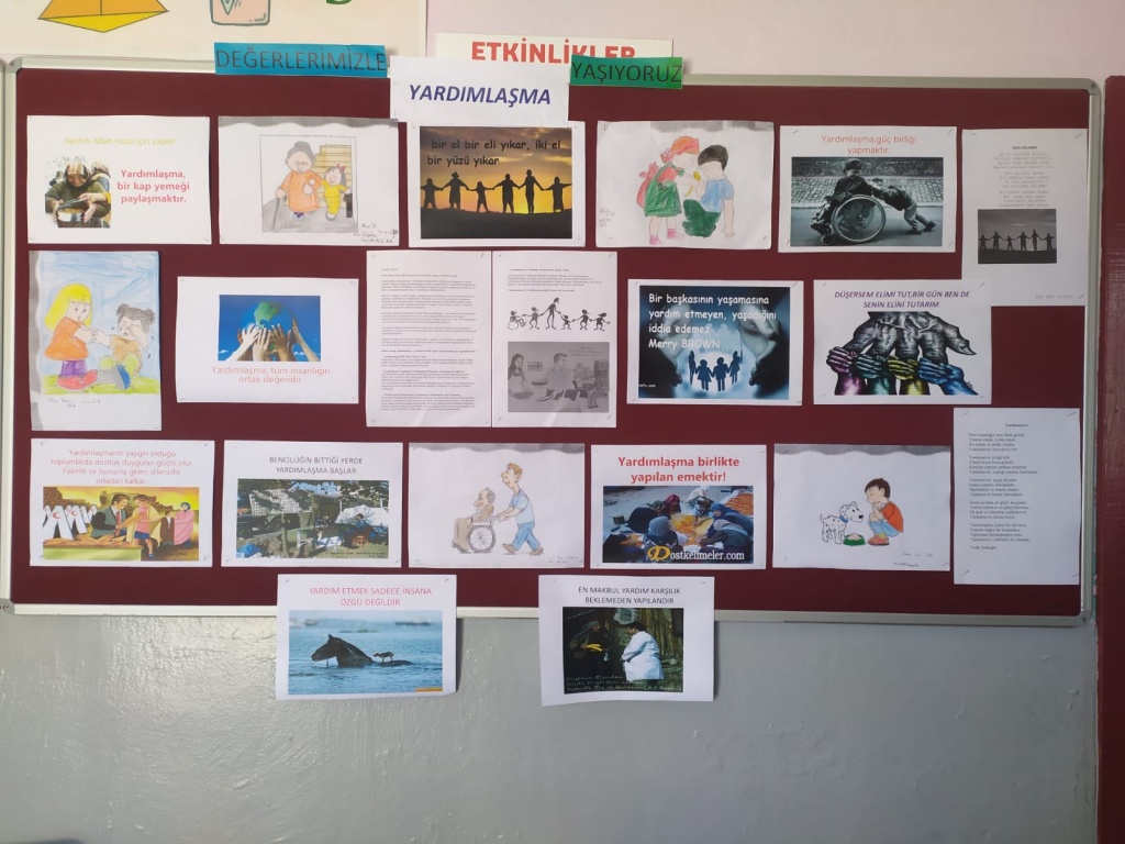 Değerlerimizle Yaşıyoruz Projesi kapsamında bu ayın değeri olan yardımlaşma ile ilgili okulumuzda aktiviteler yapılmış ayrıca öğrencilerimiz pano düzenlemişlerdir.